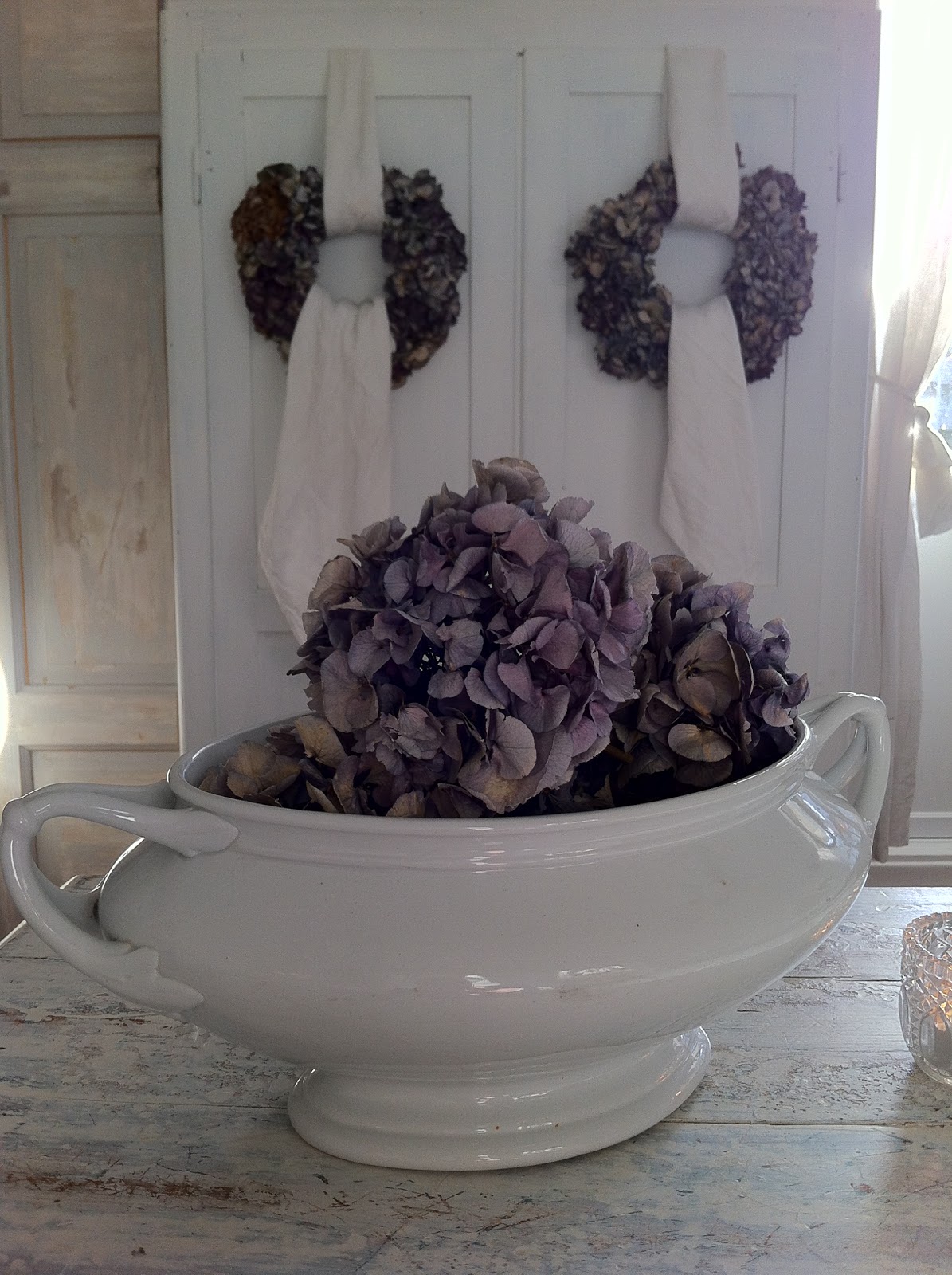 Jeg lovte og vise noen loppisfunn, og på bildet over ser dere en nydelig terrin jeg kjøpte sist helg. Synes de er så dekorative med blomster i. Nå huser den tørket hortensia, som forøvrig også henger som kranser på skapet.